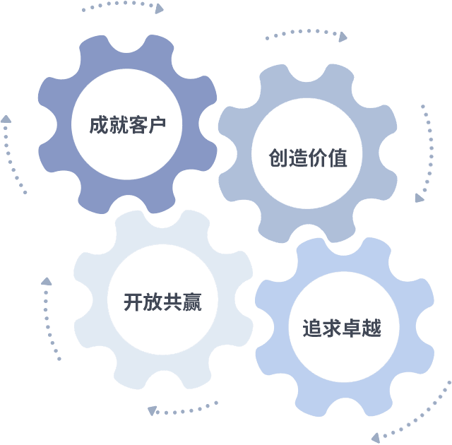 成就客户是一切决策的出发点,,,创造价值是衡量所有工作的标准,,,追求卓越是我们做事做人的态度,,,,开放共赢是我们的格局也是最终的结果。。。价值观的齿轮环环相扣,,,,推动着组织里的每个人不断向前。。。