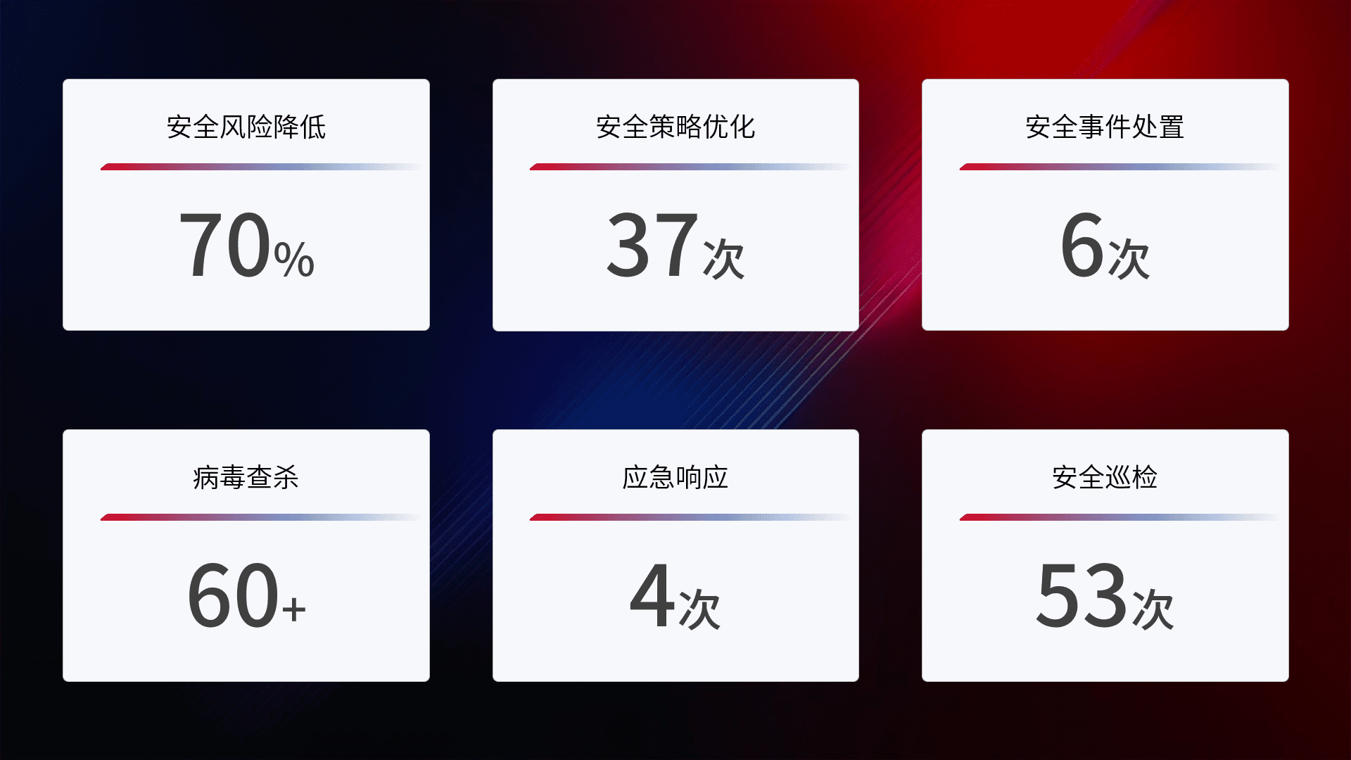 提供全面的安全事件报告体系,,,,包括处置报告、、周报、、季度和年度总结,,,,结合持续监控,,,,帮助客户深入了解网络安全状况。。