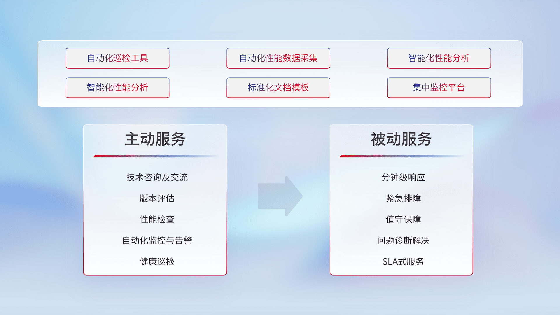 智能化工具和标准化文档,,保障服务质量,,提供主动服务(包含技术咨询、、、、版本评估、、性能检查、、自动化监控与告警、、健康巡检)和被动服务包含(分钟级响应、、紧急排障、、、、值守保障、、问题诊断解决、、SLA服务)。。